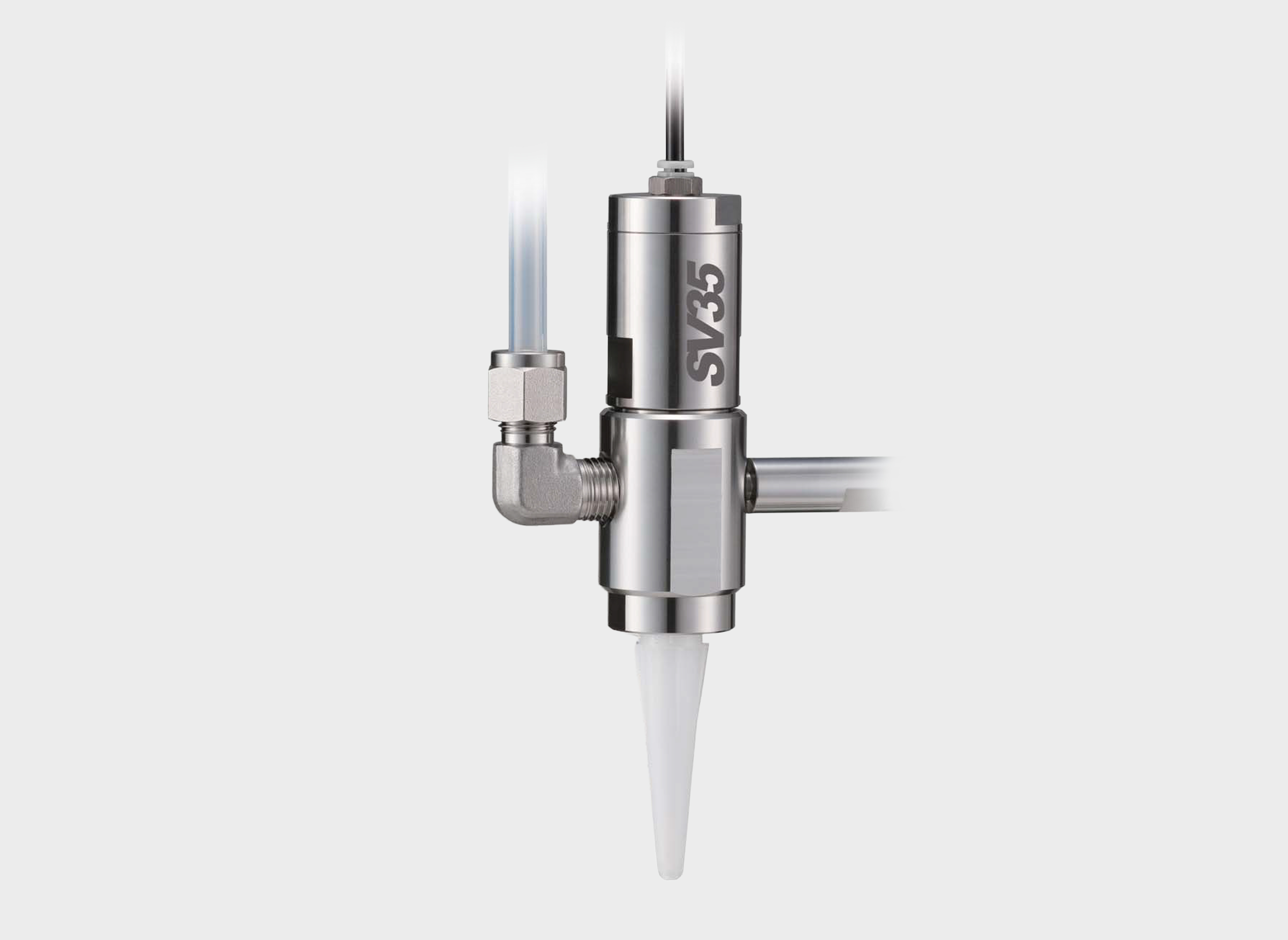 The SV35HF is a high-flow piston valve specifically designed for fast and accurate filling processes with low to high viscosity materials. It excels in precision filling applications by dispensing consistent, repeatable volumes. The valve features a fast, clean cutoff that prevents dripping and drooling, which is achieved through a pull-back movement; when the operating air exhausts, a spring retracts the piston and sealing head, stopping the fluid flow and pulling back a slight amount of material. Constructed with a stainless-steel fluid chamber and a durable UHMW sealing diaphragm, the SV35HF is a low-maintenance solution for demanding filling applications.