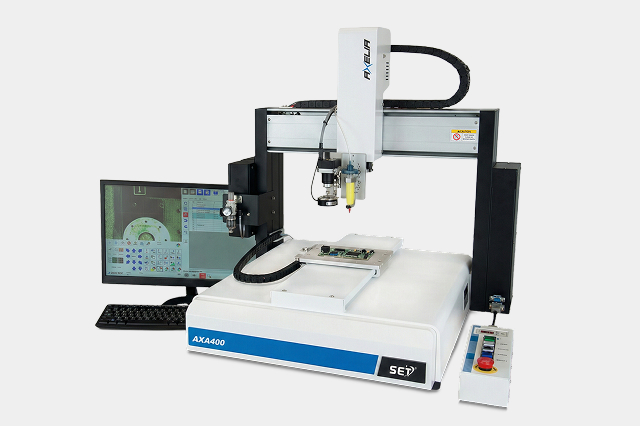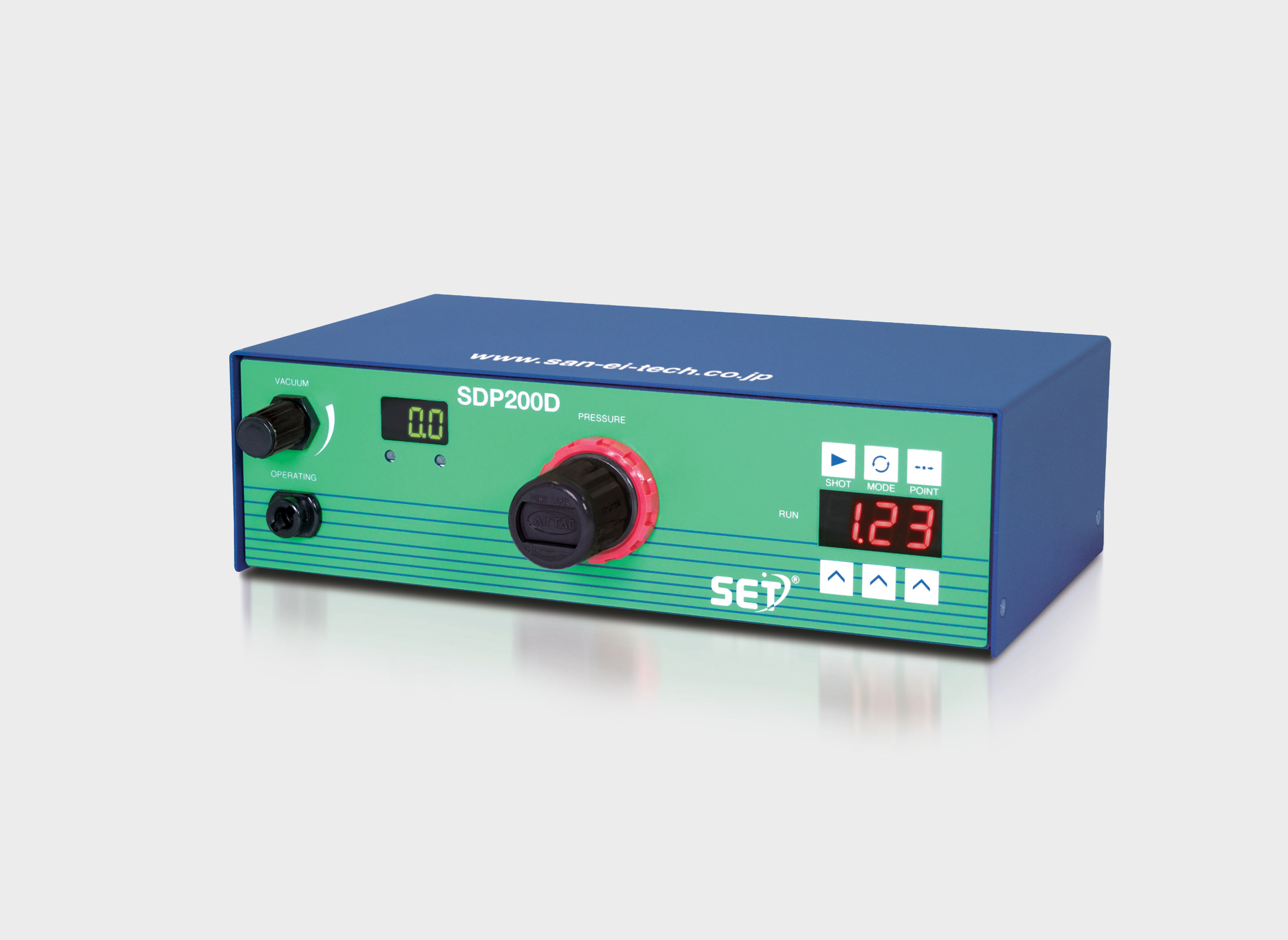 SAN-EI Tech non-contact jet dispensers deliver precise fluid dot placement without substrate contact for electronics assembly, underfill, conformal coating, and automated manufacturing applications. Two technologies are available: pneumatic jetting up to 250Hz and piezoelectric jetting up to 1,000Hz — accommodating a wide range of materials including adhesives, UV adhesives, greases, and silver pastes.